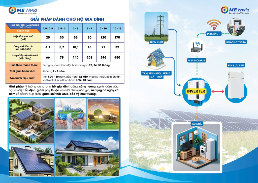 ME World sử sản phẩm từ các thương hiệu uy tín, các tấm PV trong Top 5 thế giới như Jinko, Trina, JA, Canadian,… (hiệu suất 20-25%) và inverter chất lượng cao như Sungrow, Growatt, Solis,…. (tổn thất <5%) đảm bảo tối ưu năng lượng